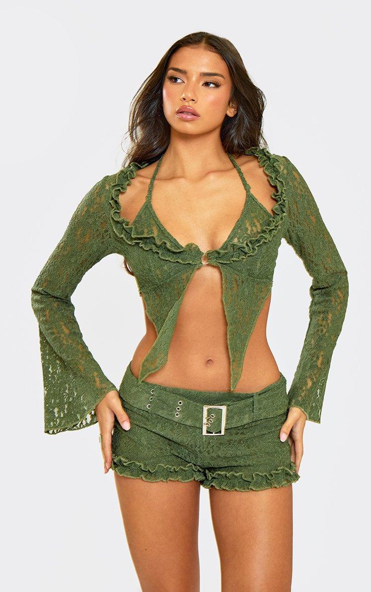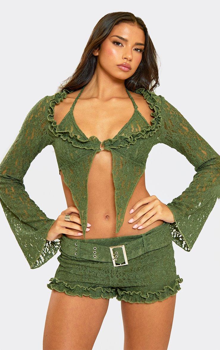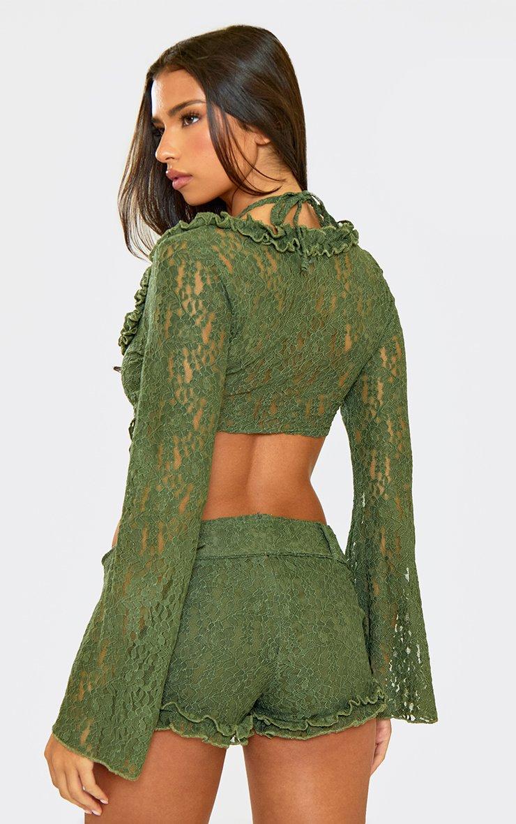 Flared Long Sleeve Split Hem Top In Green Lace