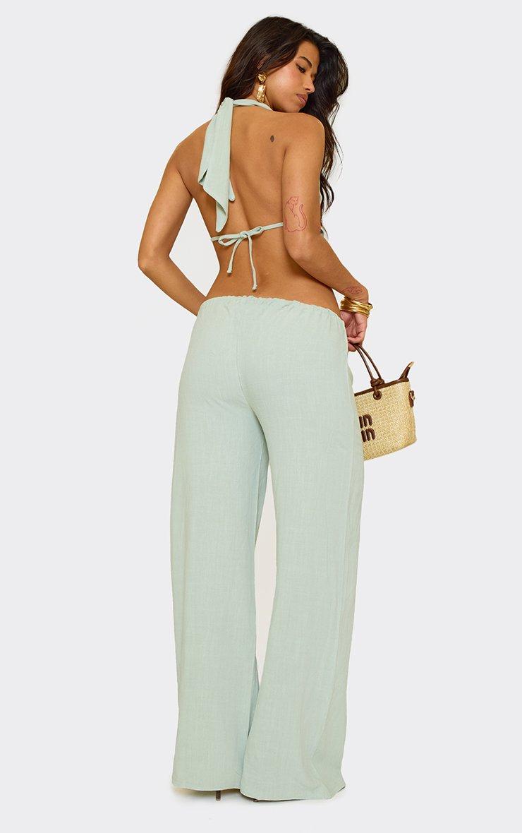 Low Rise Tie Waist Wide Leg Detail Trousers In Sage Green Linen