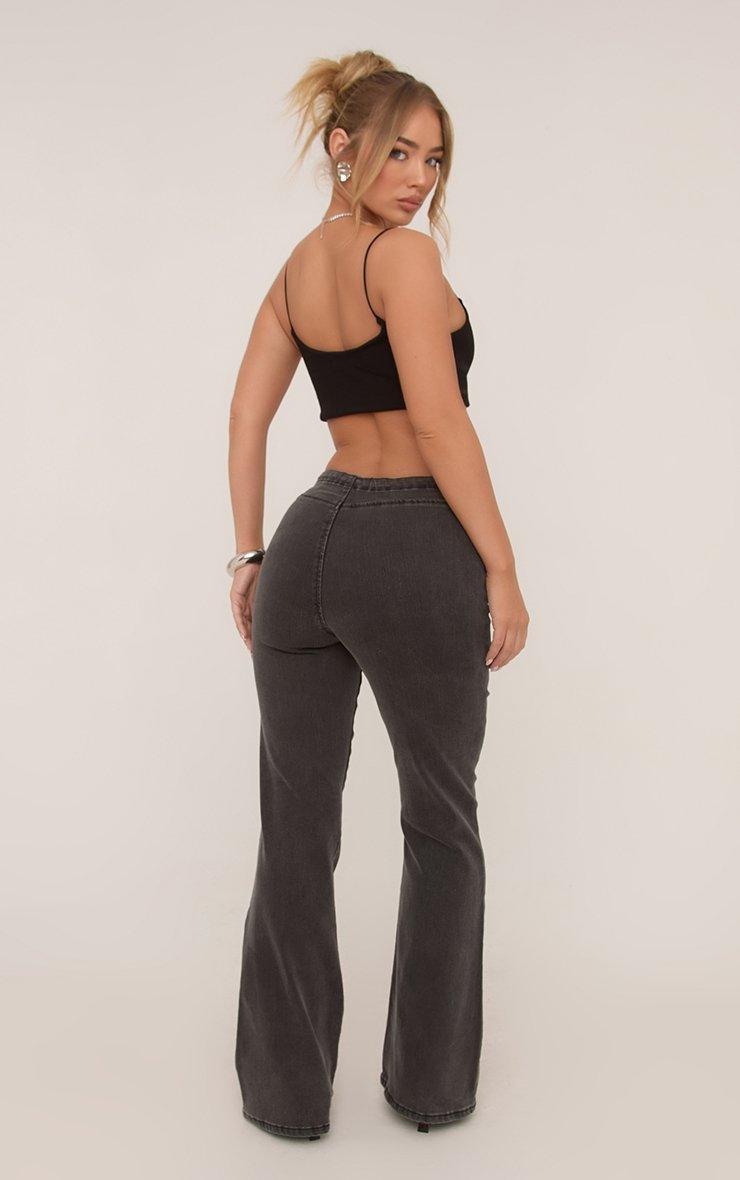 Mid Rise Tie Front Detail Flared Leg Jeans In Black Vintage Wash Denim
