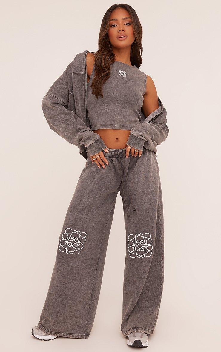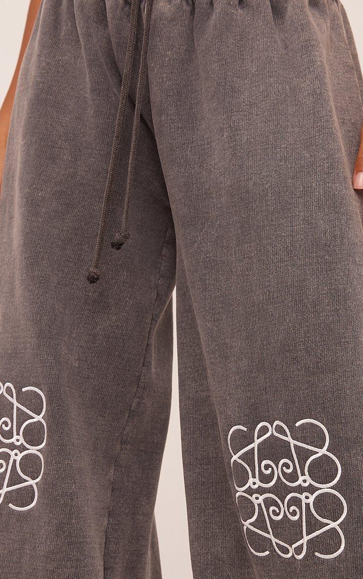 mid rise swirl graphic wide leg slouchy joggers in grey acid wash