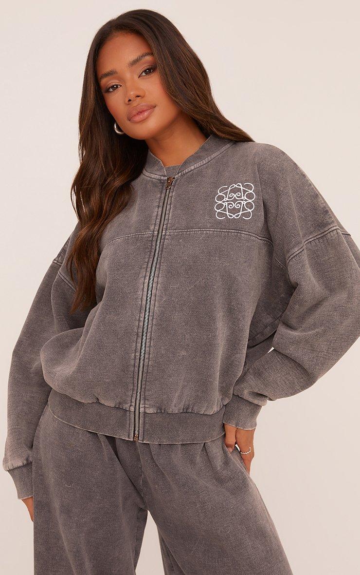 Long Sleeve Embroidered Swirl Logo Zip Up Jacket In Grey Marl
