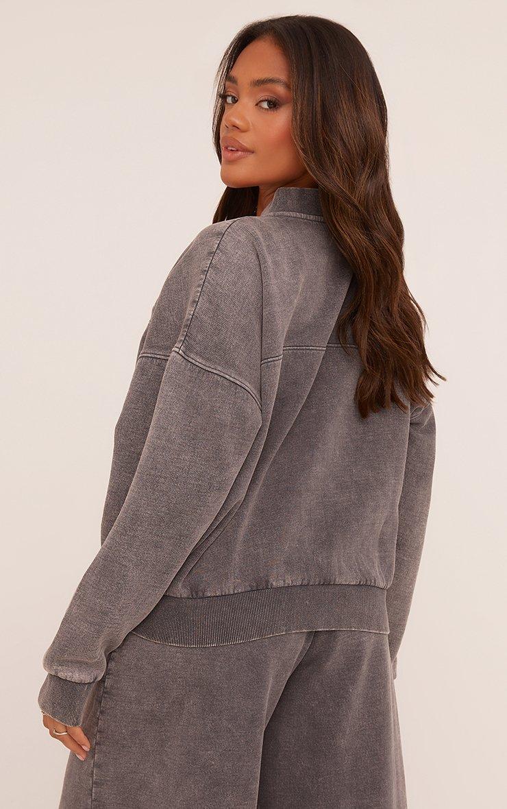 Split Sleeve Plunge Stud Detail Zip Jacket In Charcoal Grey Faux Leather