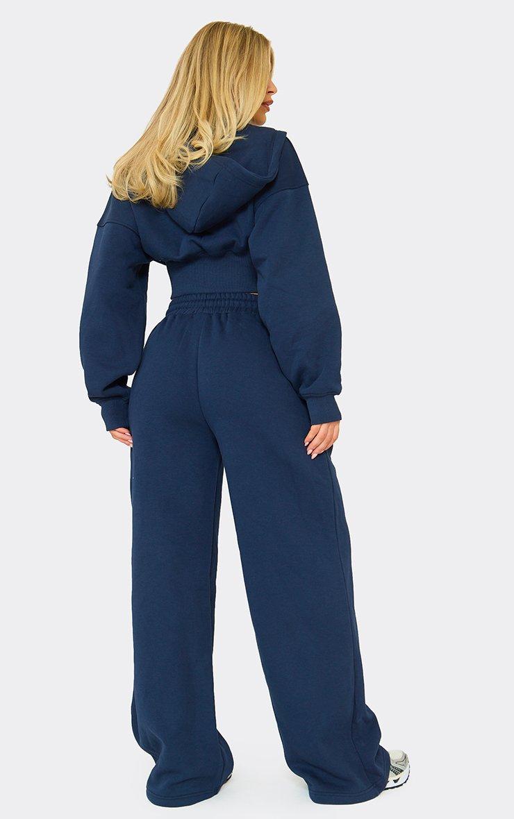 Mid Rise Contrast Piping Detail Wide Leg Joggers In Dark Navy Blue