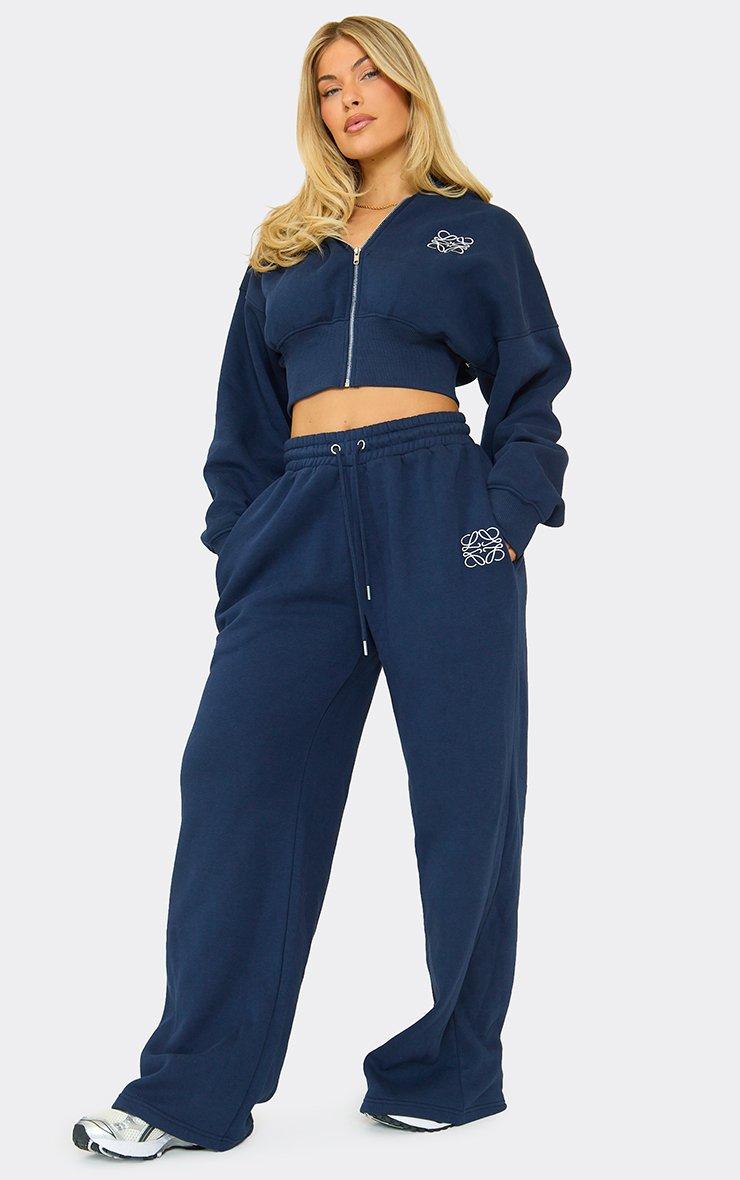 Mid Rise Graphic Detail Wide Leg Joggers In Navy Blue