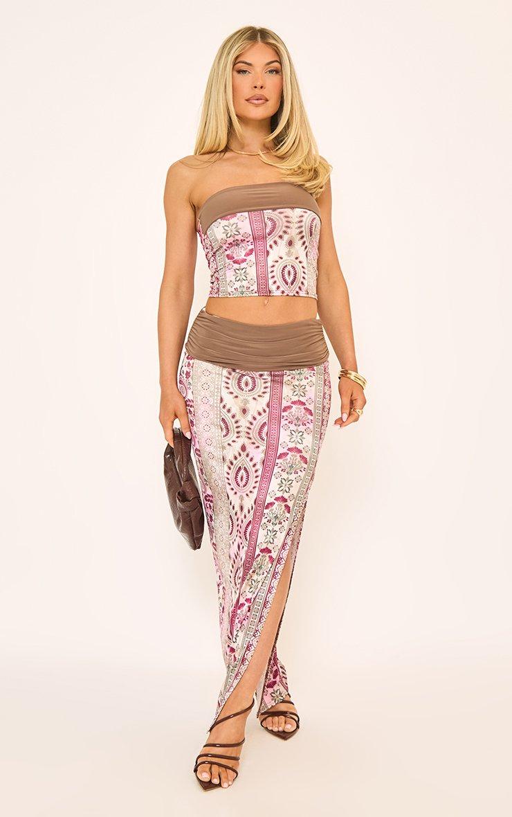 Contrast Fold Over Waistband Maxi Skirt In Pink Abstract Print Slinky
