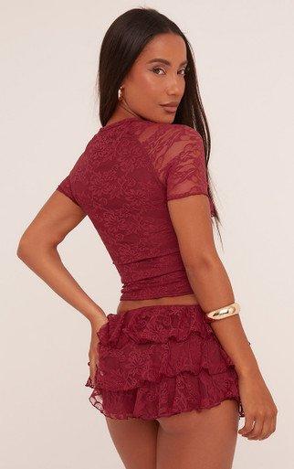 Low Rise Frill Shorts In Burgundy Lace
