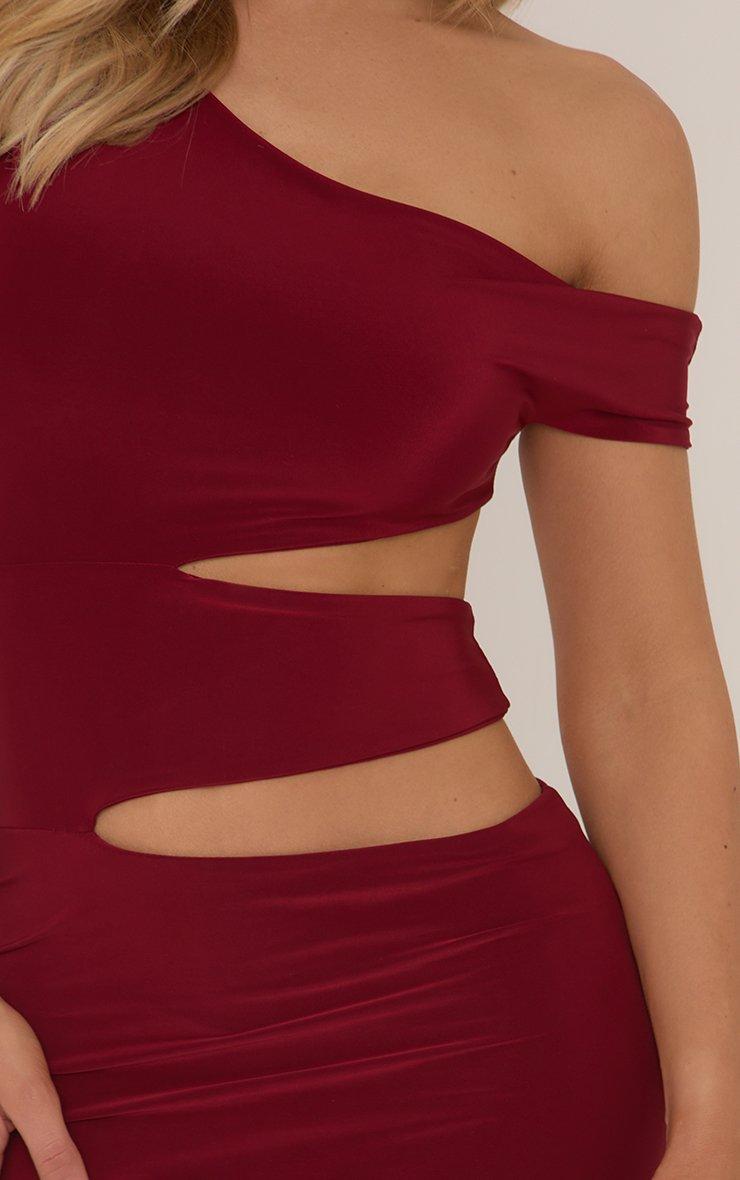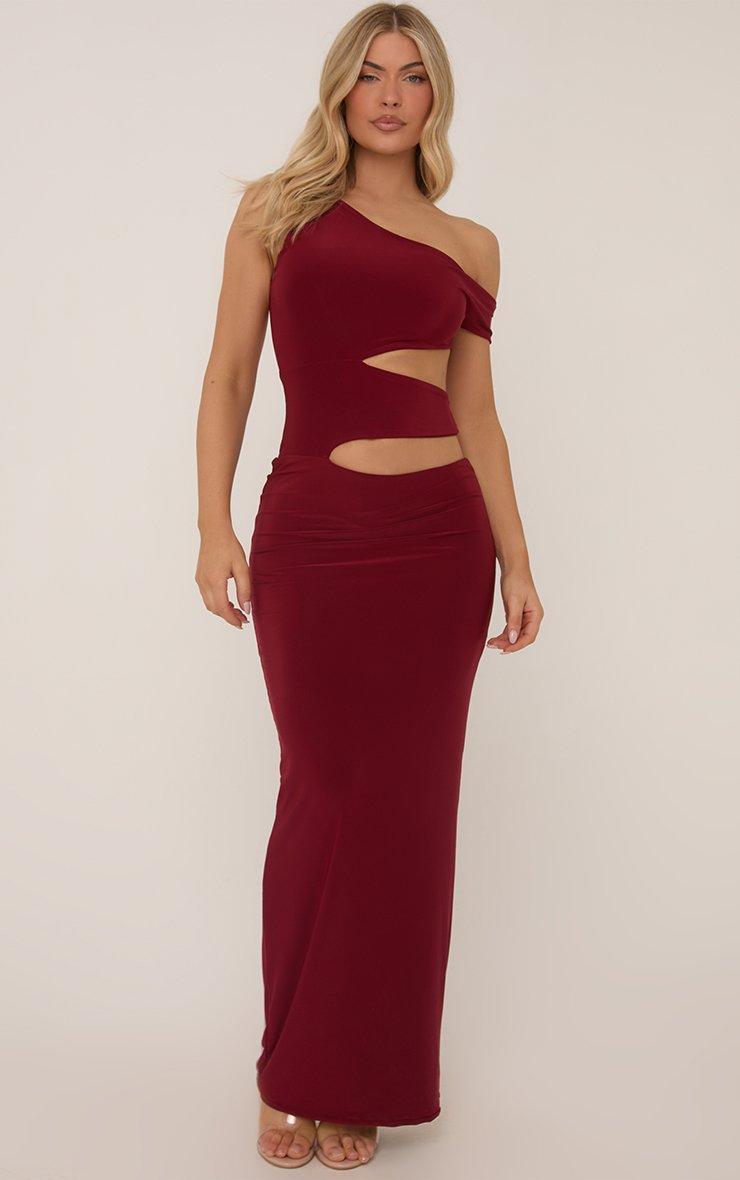 Asymmetric One Shoulder Cut Out Maxi Dress In Burgundy Slinky