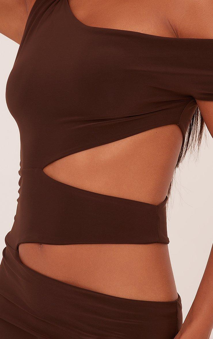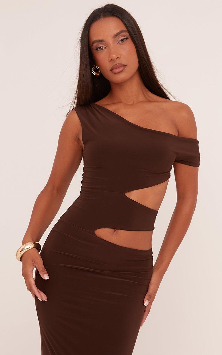 Asymmetric One Shoulder Cut Out Maxi Dress In Chocolate Brown Slinky