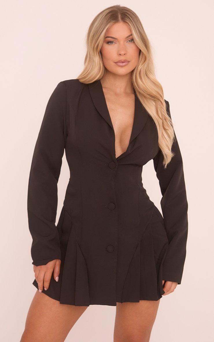 Long Sleeve Button Front Pleated Blazer Dress In Black Woven