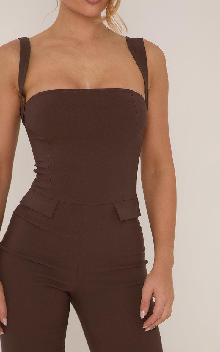 Square Neck Tailored Flared Jumpsuit In Chocolate Brown Woven