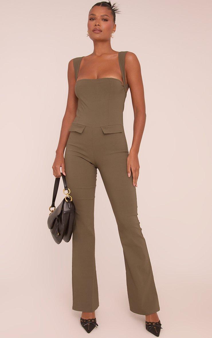Square Neck Tailored Flared Jumpsuit In Green Woven
