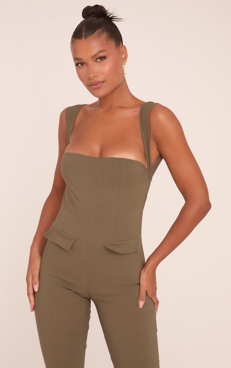 Plunge Neck Shoulder Pad Detail Tailored Playsuit In Brown
