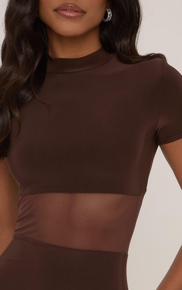 Short Sleeve High Neck Mesh Insert Maxi Dress In Chocolate Brown Slinky