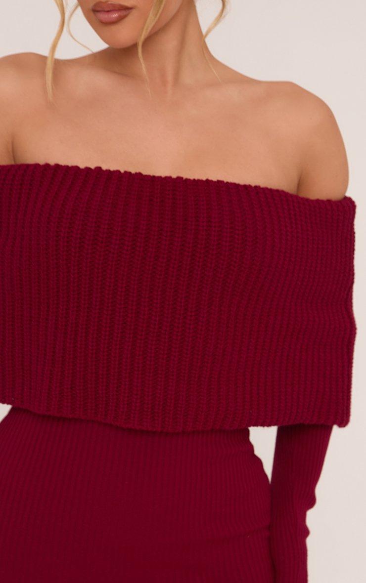Long Sleeve Fold Over Bardot Chunky Jumper Dress In Burgundy Knit