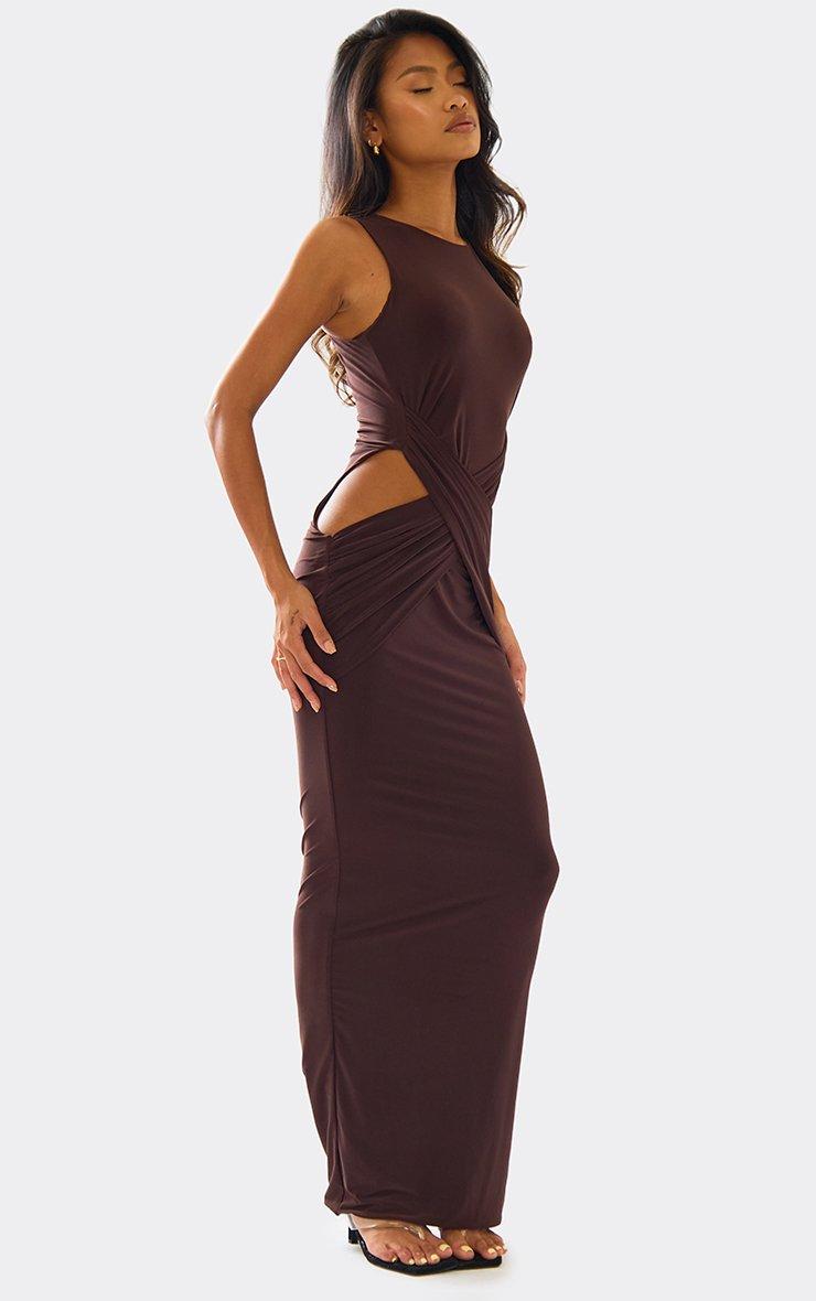 sleeveless cut out side twist front maxi dress in chocolate brown slinky