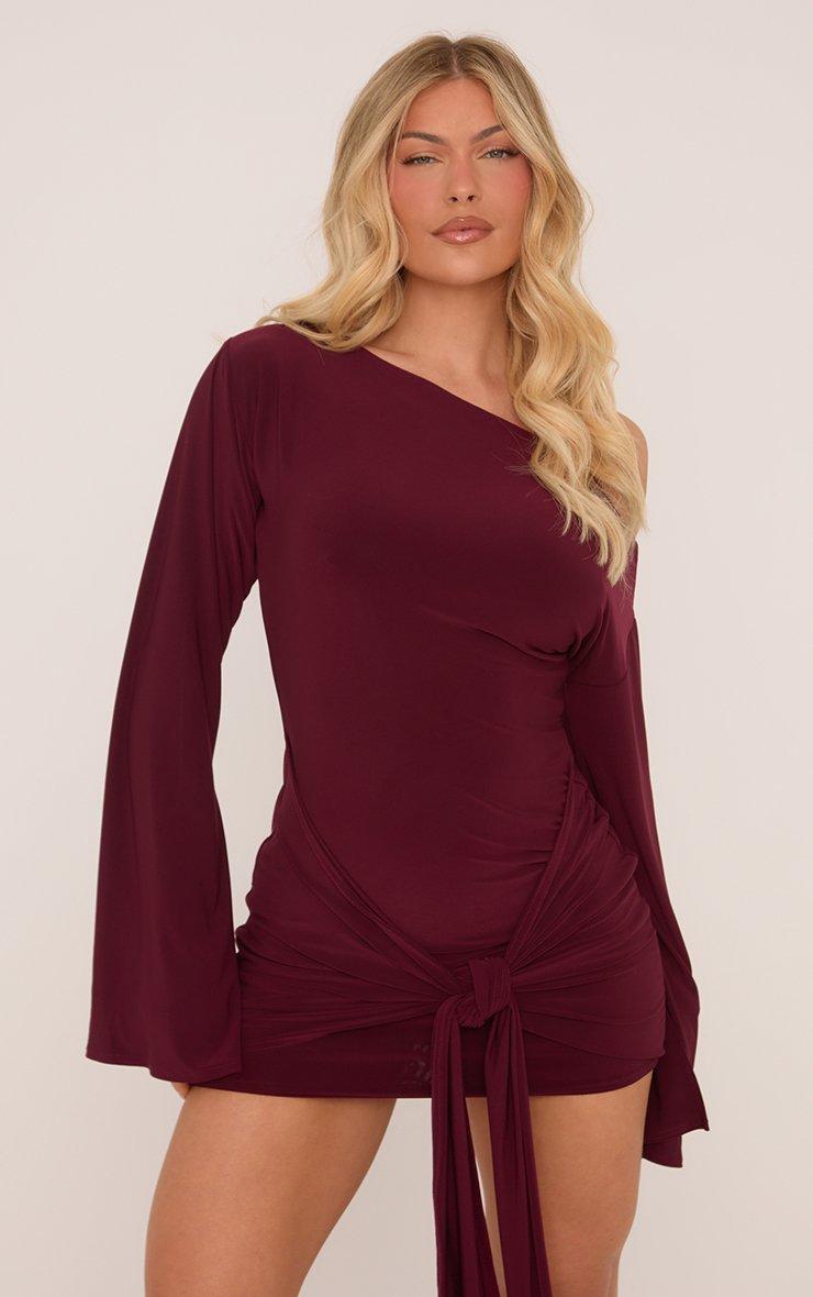 Long Flared Sleeve Drape Detail Mini Bodycon Dress In Burgundy Slinky