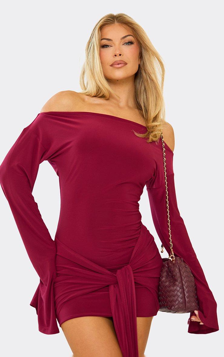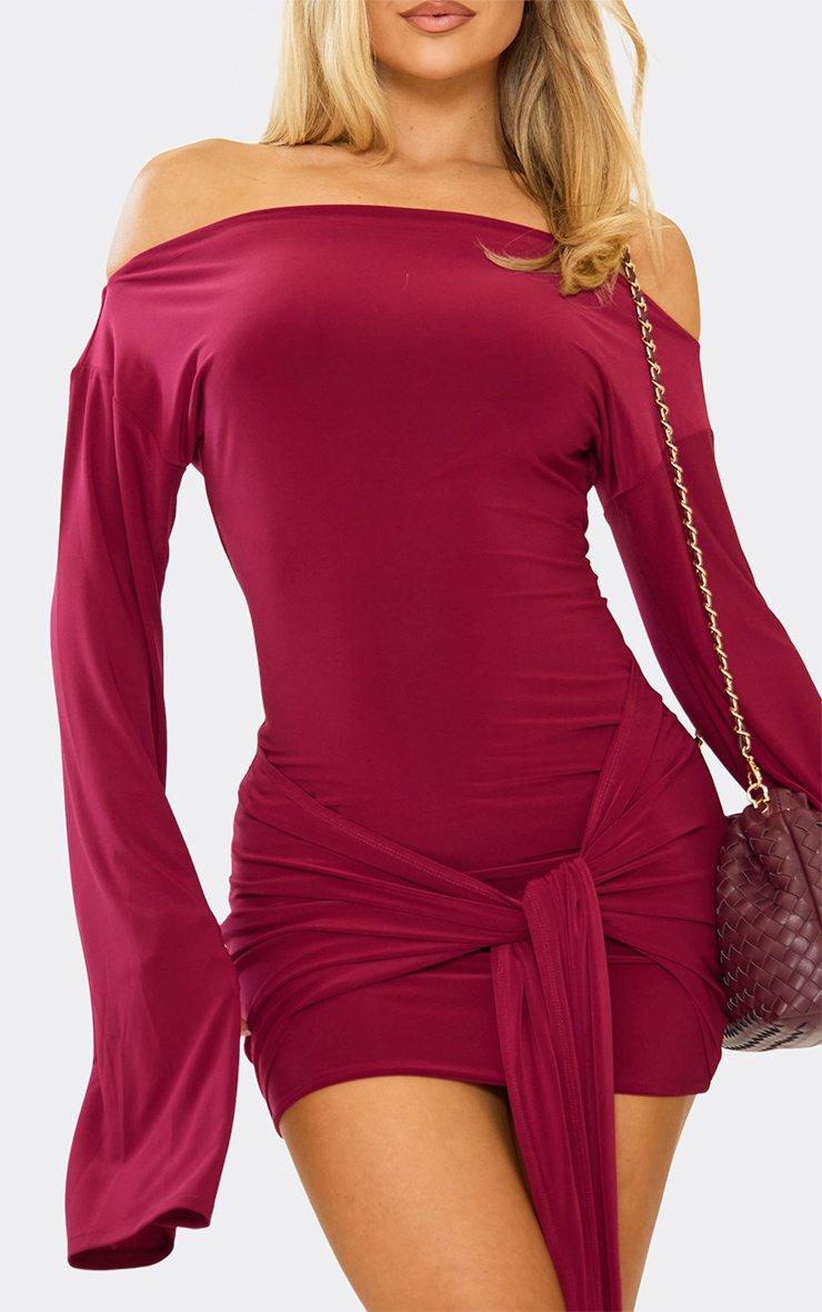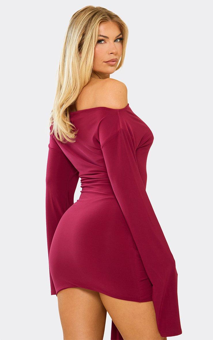 Long Flared Sleeve Drape Detail Mini Bodycon Dress In Red Slinky