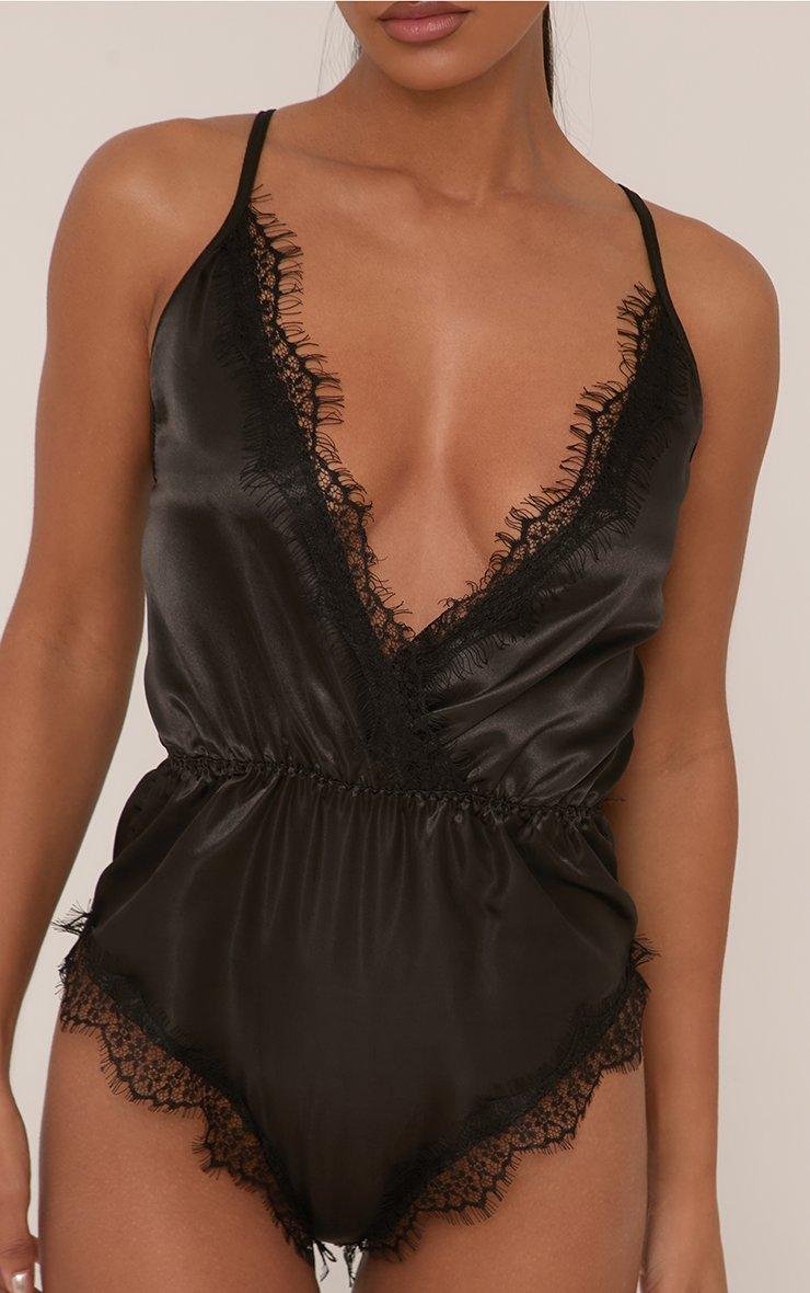 Plunge Lace Trim Nightwear Romper In Black Satin