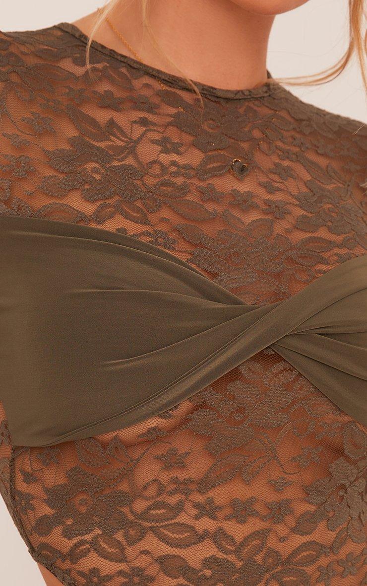 long sleeve slinky twist bust detail bodysuit in khaki green lace