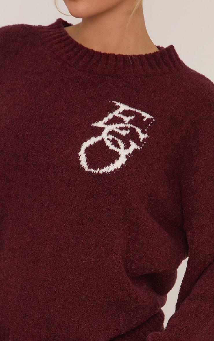 Long Sleeve Crew Neck Ego Graphic Oversized Jumper In Burgundy Knit