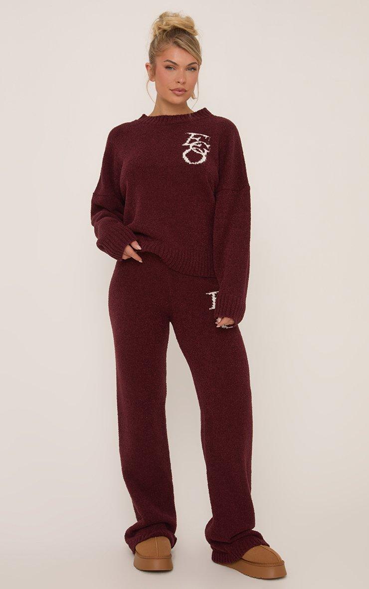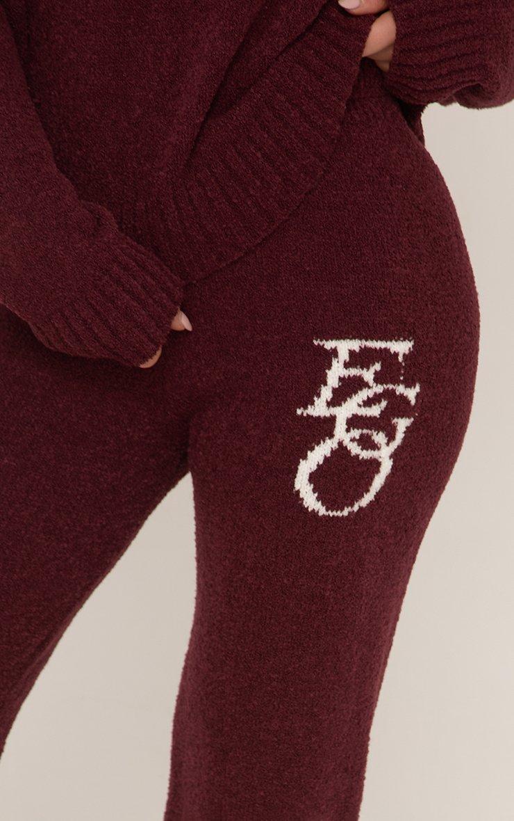 Mid Waist Ego Graphic Straight Leg Trousers In Burgundy Knit