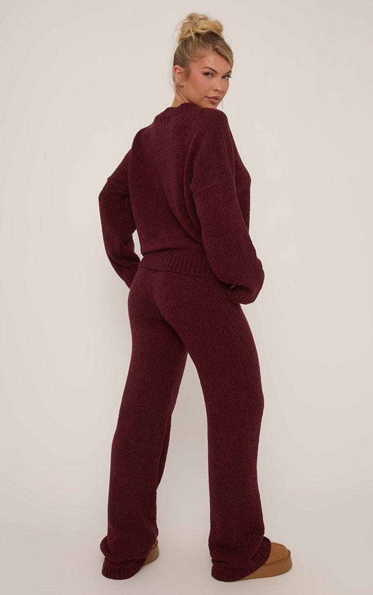 Mid Rise Wide Leg Trousers In Burgundy Boucle Knit