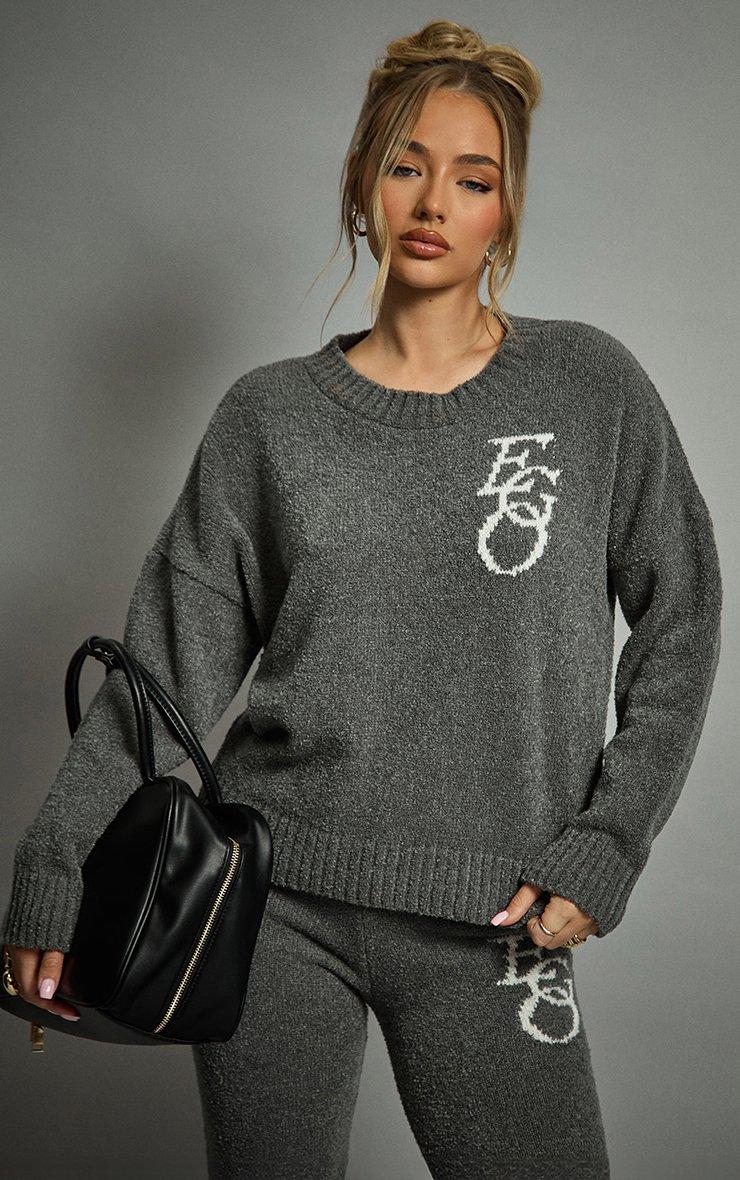 Mid Rise Fluffy Essential Logo Detail Wide Leg Trousers In Grey Knit