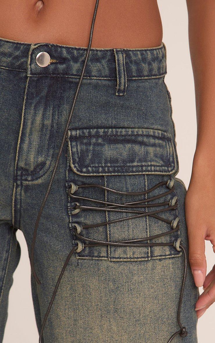 mid rise lace up front wide leg jeans in vintage blue denim