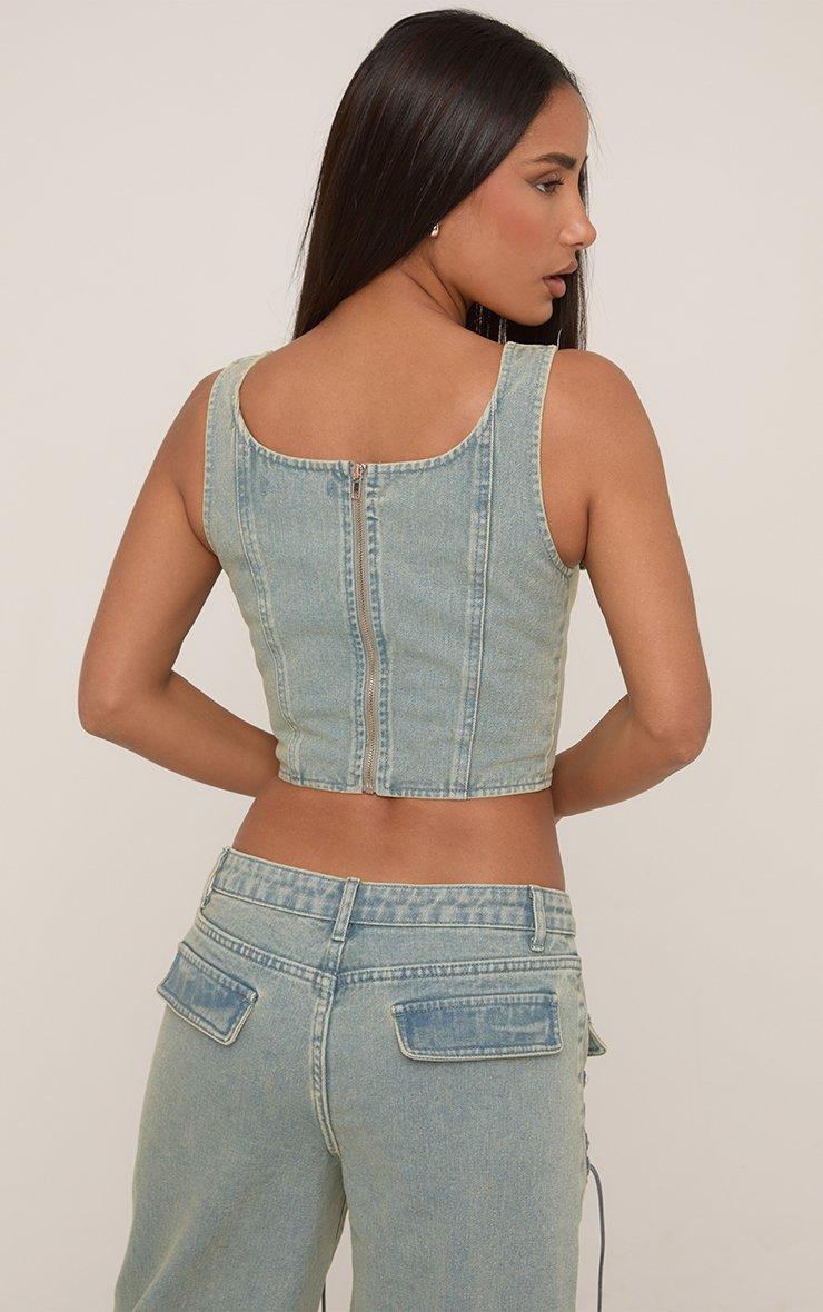 Sleeveless Lace Up Front Crop Top In Light Blue Vintage Wash Denim