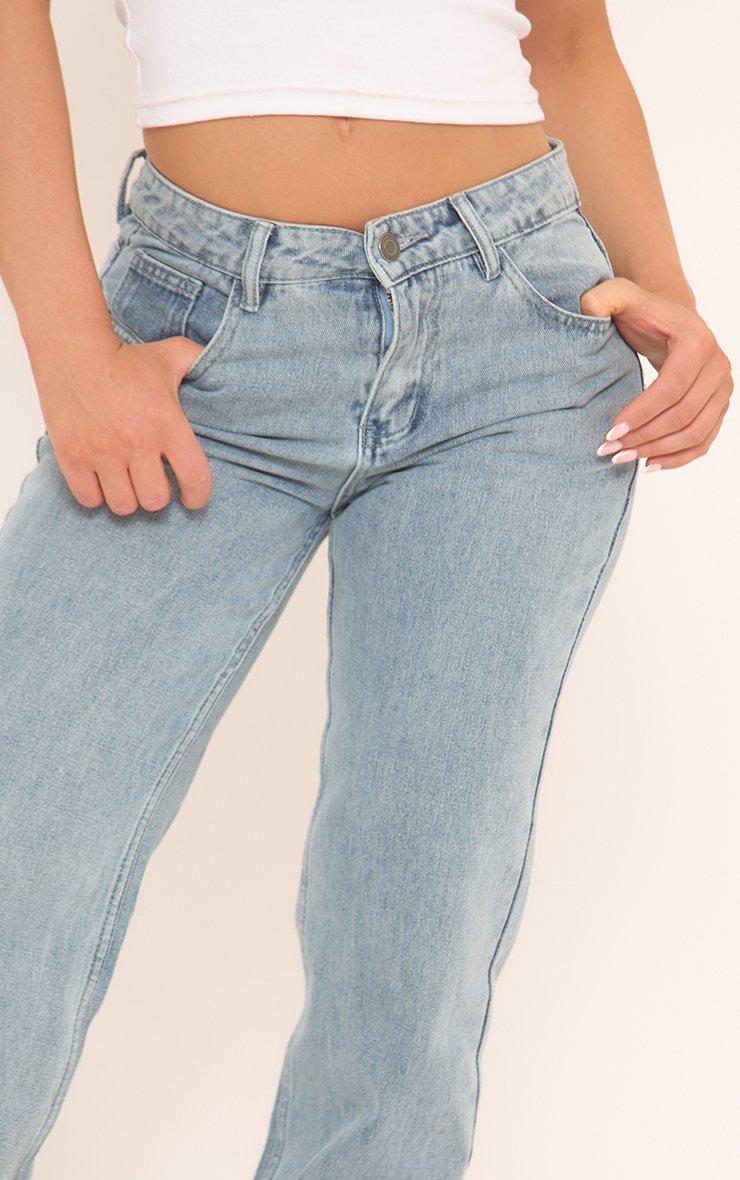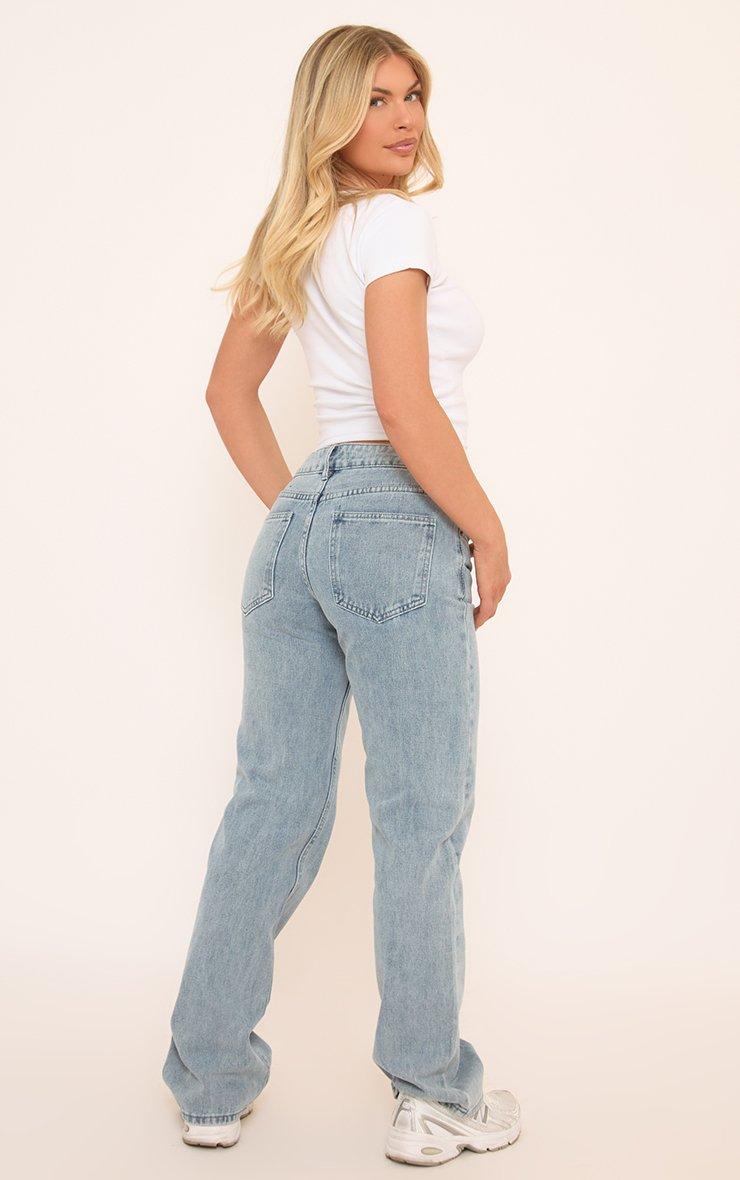 Low Rise Frayed Distressed Hem Detail Straight Leg Jeans In Blue Denim