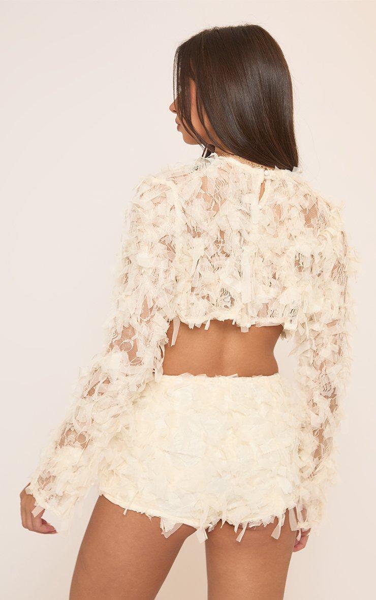 Low Rise All Over Frill Detail Booty Shorts In Cream Texture