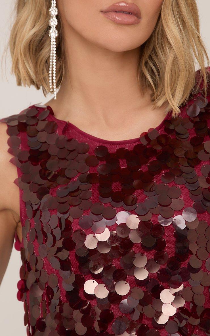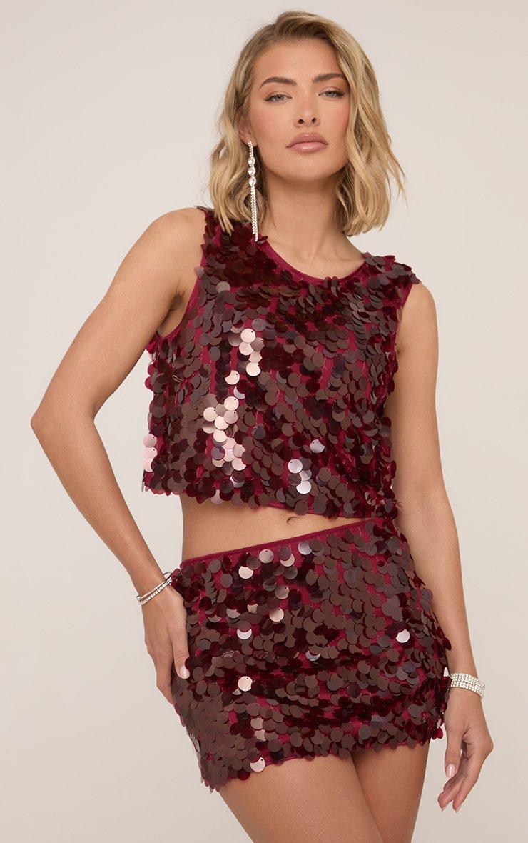 Sleeveless Low Back Boxy Top In Burgundy Disc Sequin