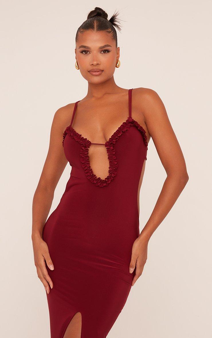 plunge frill edge detail cut out side split maxi dress in burgundy slinky