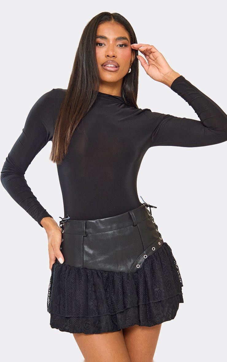 High Waist Lace Up Detail Textured Frill Hem Mini Skirt In Black Faux Leather