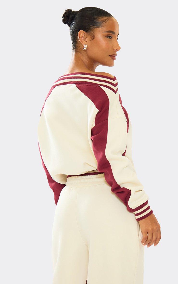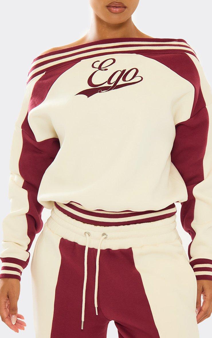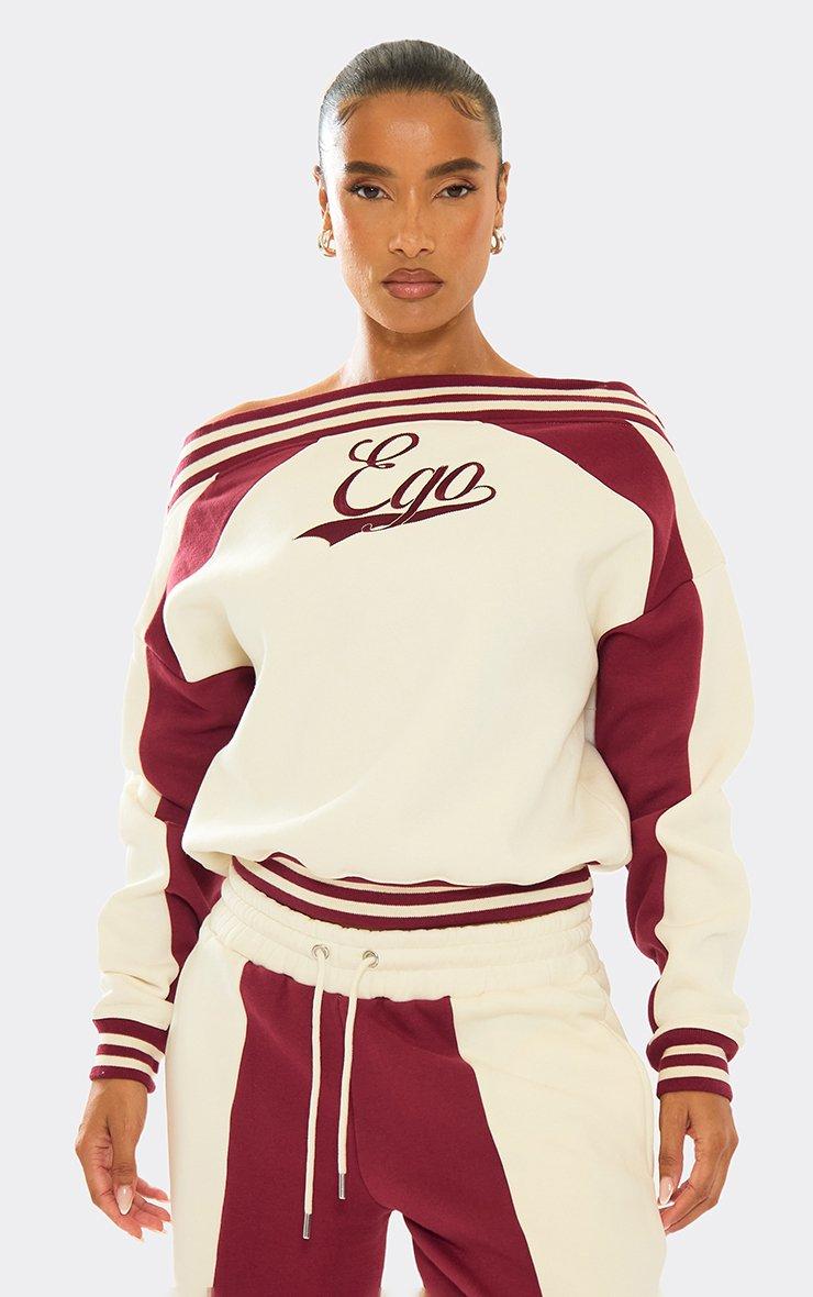 Oversized Bardot Contrast Stripe Ego Graphic Sweater In Burgundy