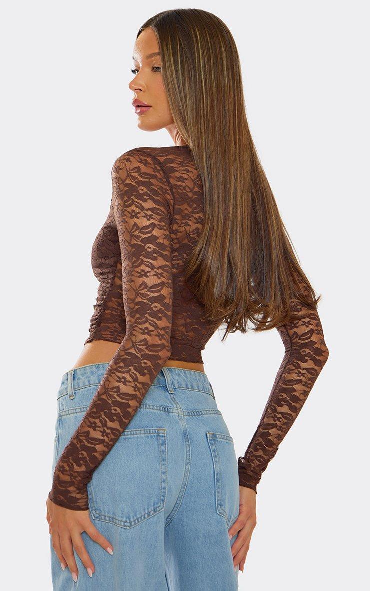 Long Sleeve Cut Out Crop Top In Chocolate Brown Lace