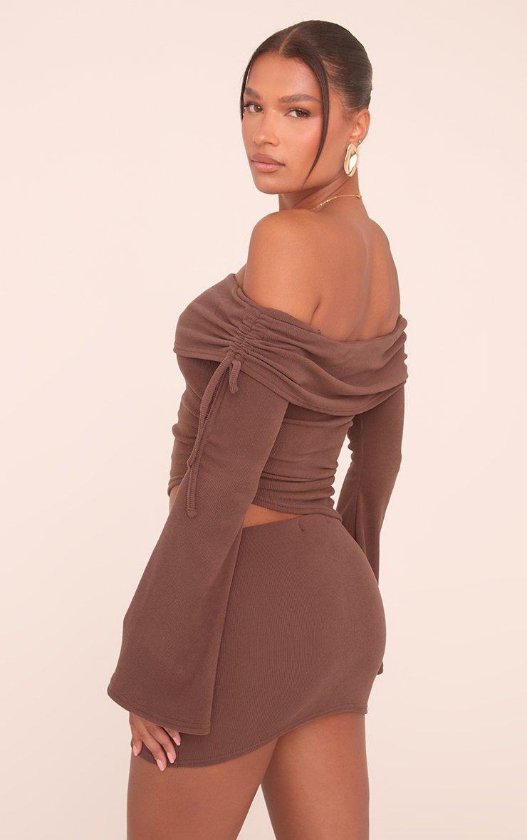 Fold Over Bardot Long Flared Sleeve Asymmetric Top In Chocolate Brown Brushed Rib