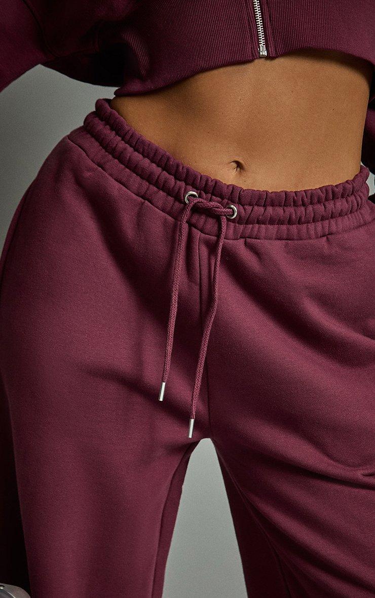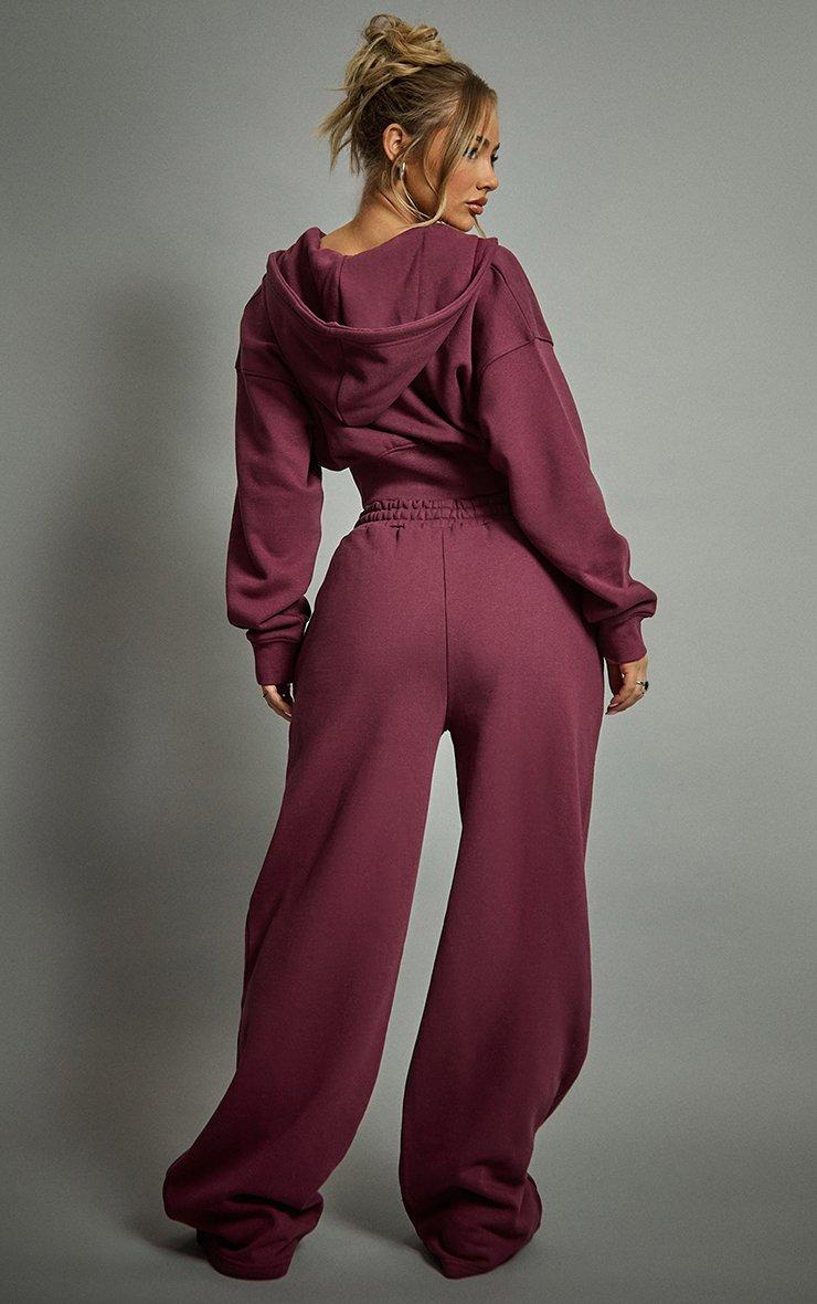 Tie Waist Wide Leg Detail Joggers In Dark Plum