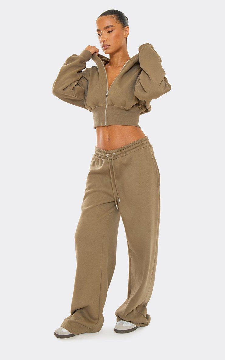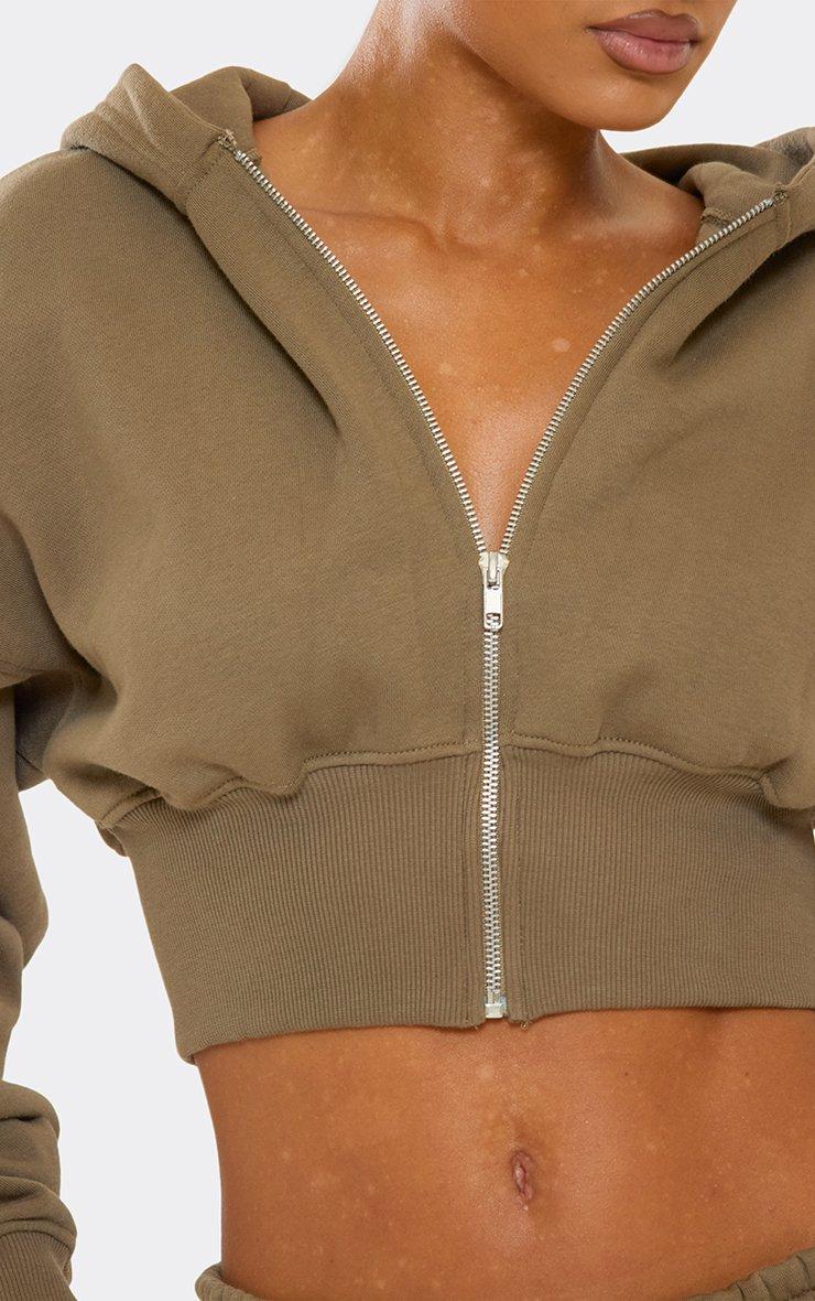 Long Sleeve Graphic Detail Zip Up Cropped Hoodie In Olive Green