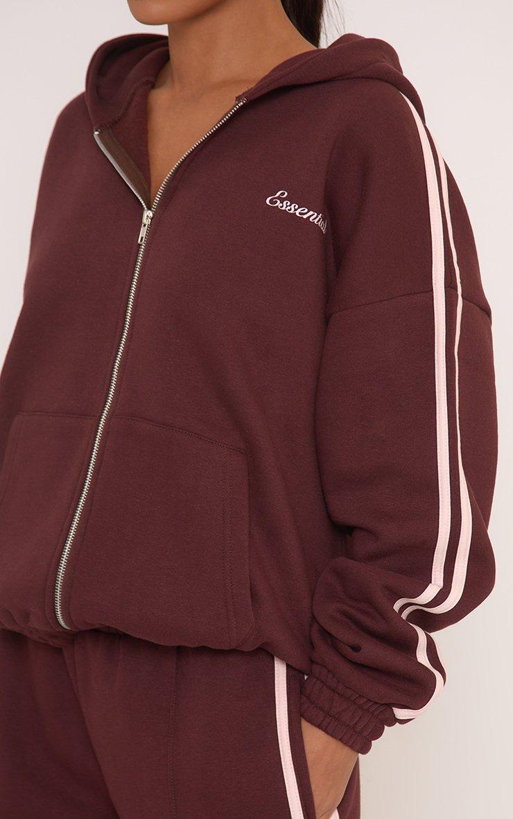 Oversized Contrast Stripe Side Essential Graphic Zip Up Hoodie In Brown