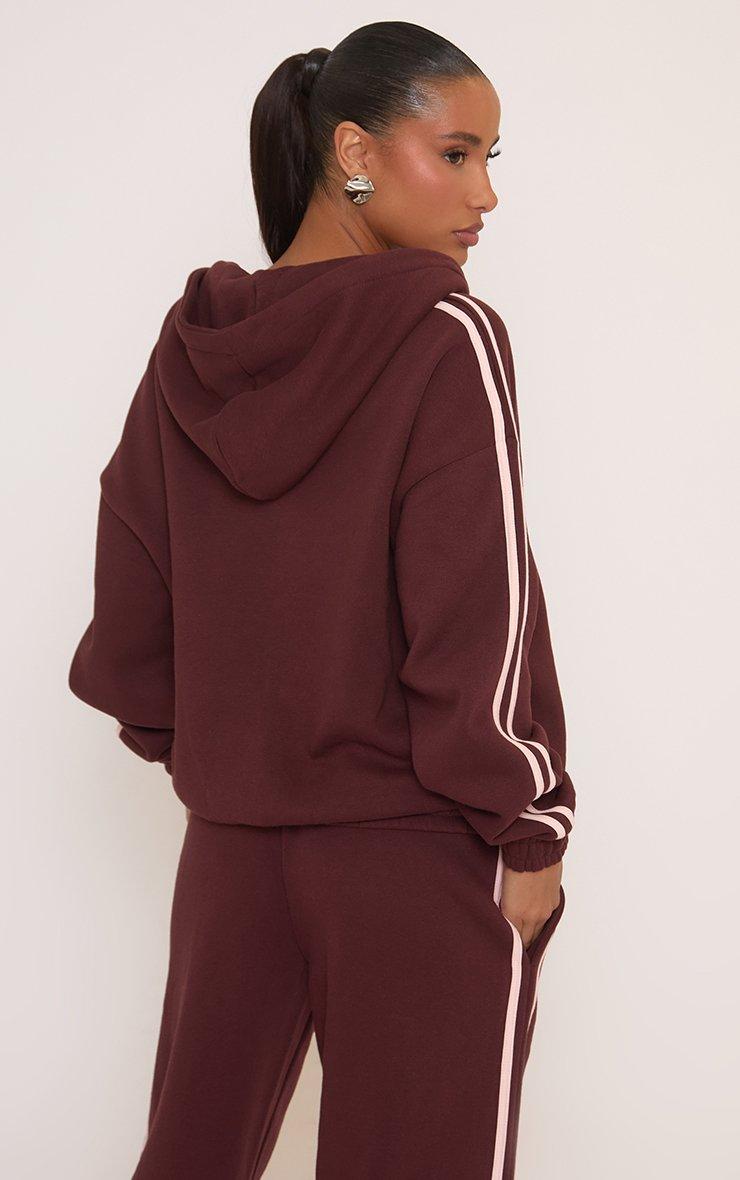 Long Sleeve Contrast Side Stripe Zip Up Oversized Hoodie In Brown
