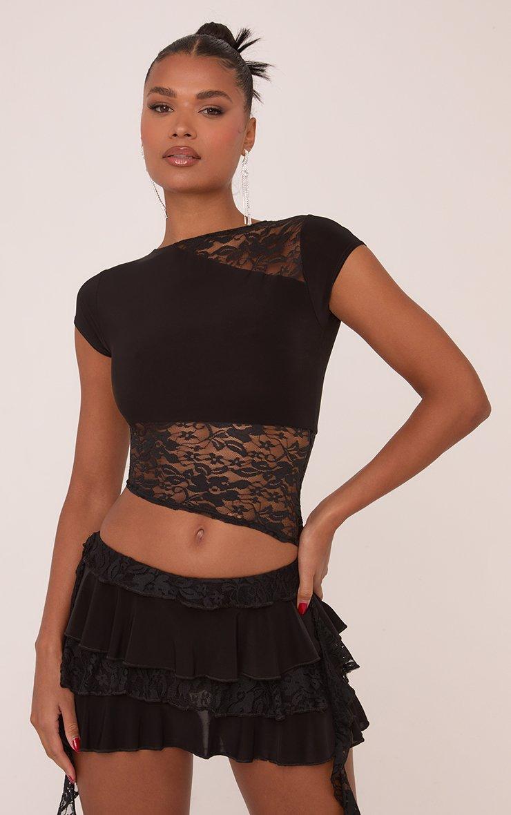 Short Sleeve Lace Detail Cropped T-Shirt In Black Slinky