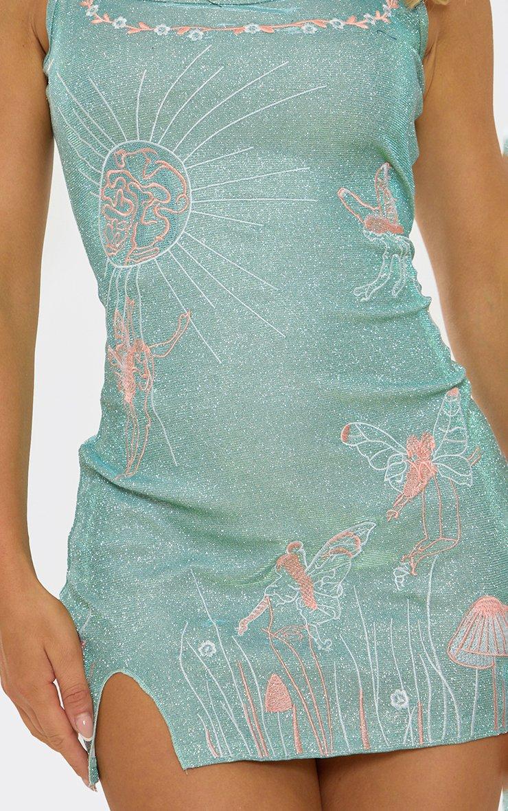 Square Neck Midnight Graphic Print Mini Bodycon Dress In Light Blue Glitter