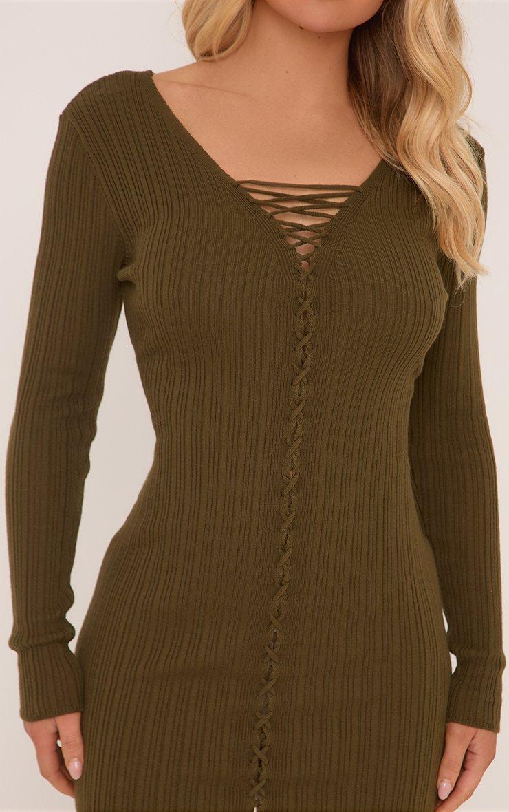 Long Sleeve Lace Up Mini Dress In Khaki Green Knit