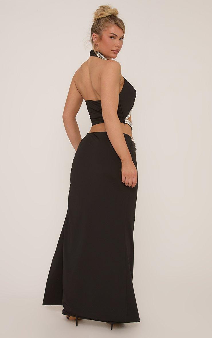 High Neck Diamante Trim Detail Cut Out Side Split Maxi Dress In Black