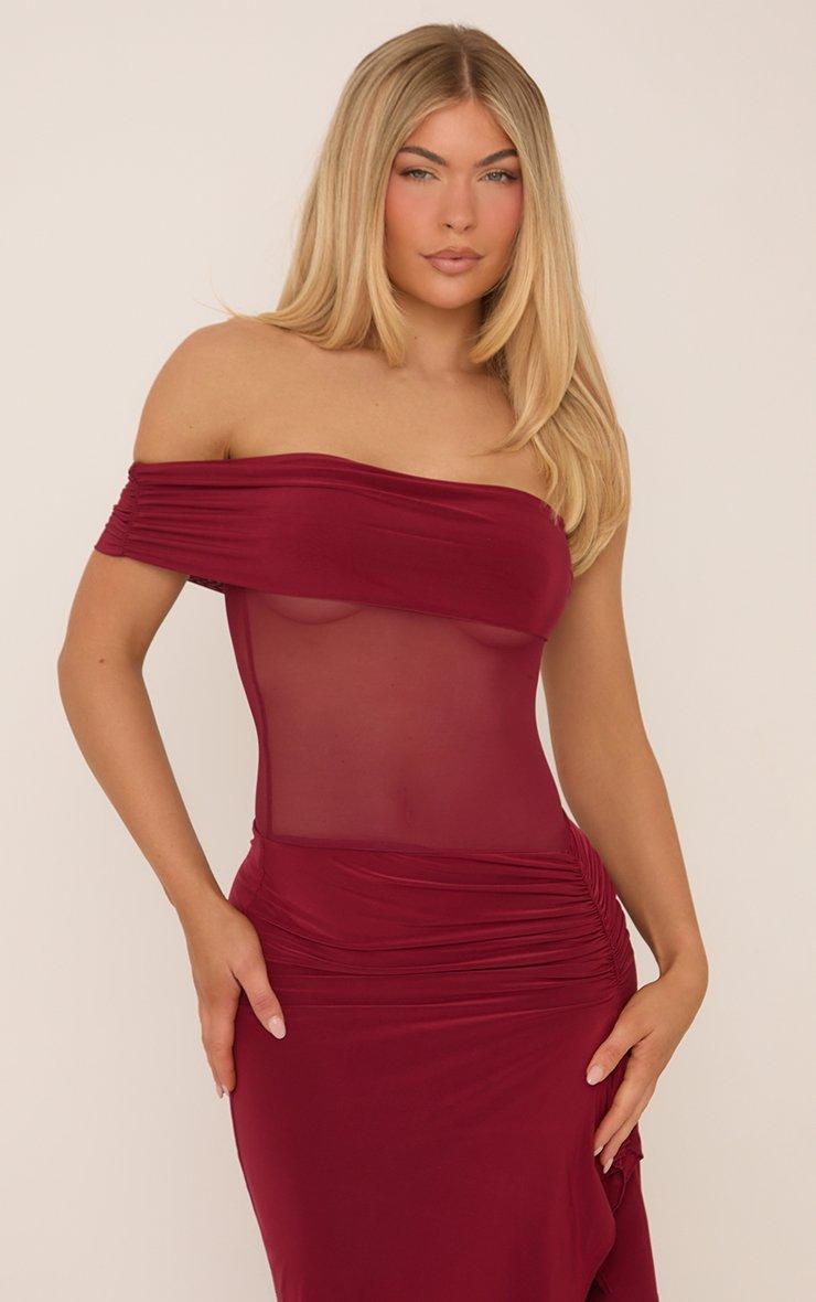 Bardot One Shoulder Mesh Insert Maxi Dress In Burgundy Slinky