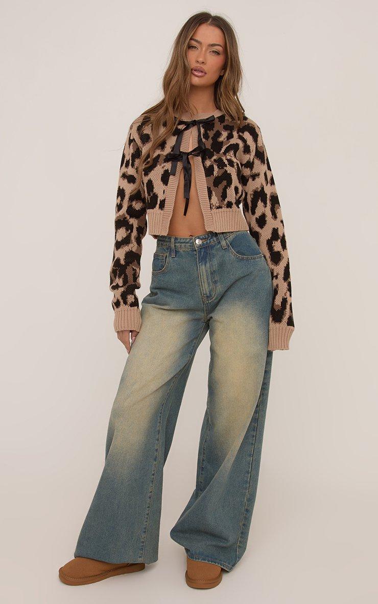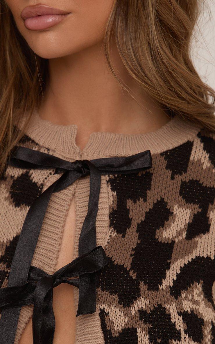 Bow Front Cropped Cardigan In Leopard Print Knit