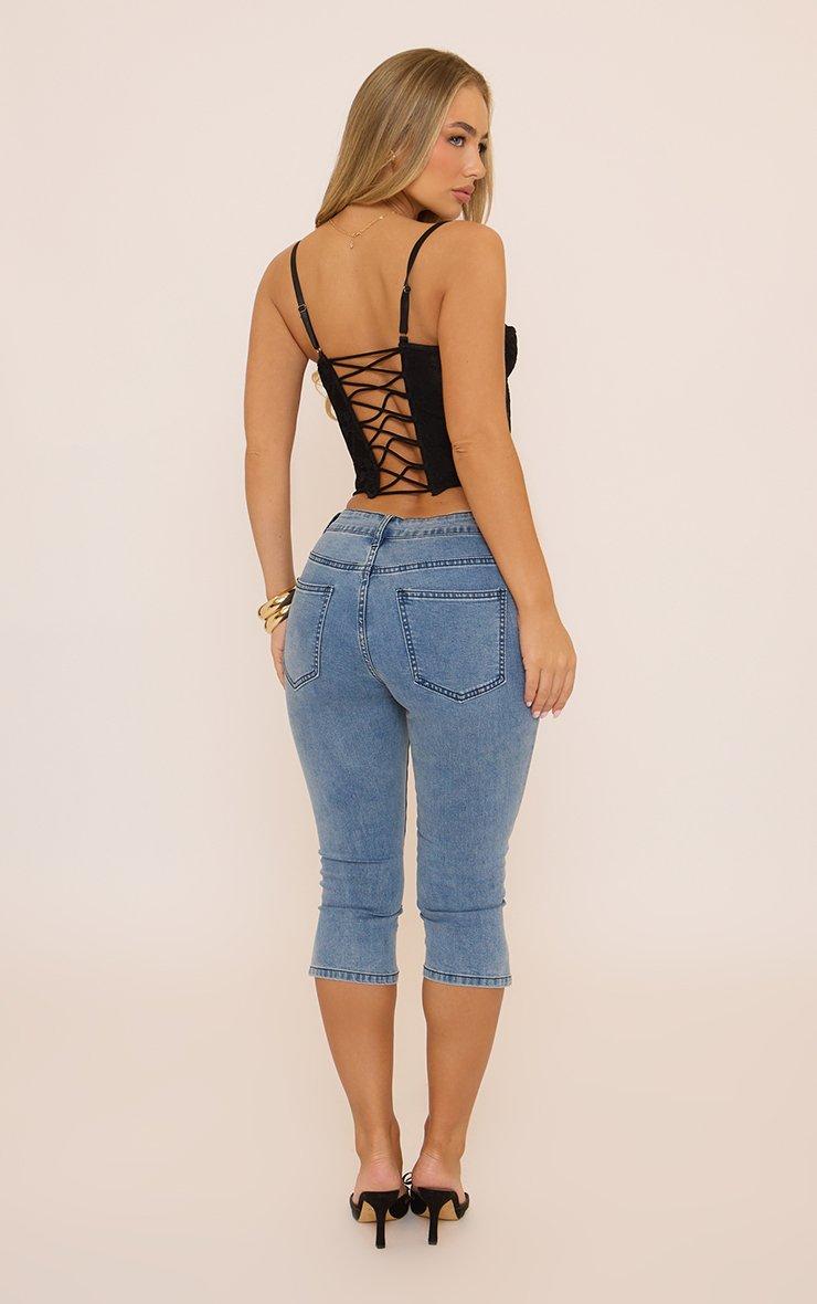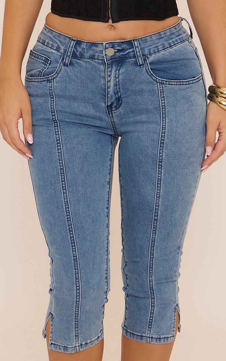 Low Rise Button Up Seam Detail Capri Jeans In Indigo Blue Denim