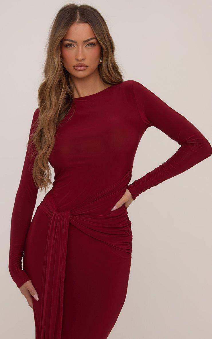 Long Sleeve Drape Waist Detail Maxi Dress In Burgundy Slinky