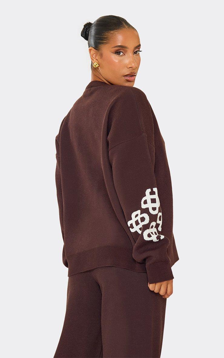 Long Sleeve Crew Neck Ego Graphic Oversized Jumper In Brown Knit
